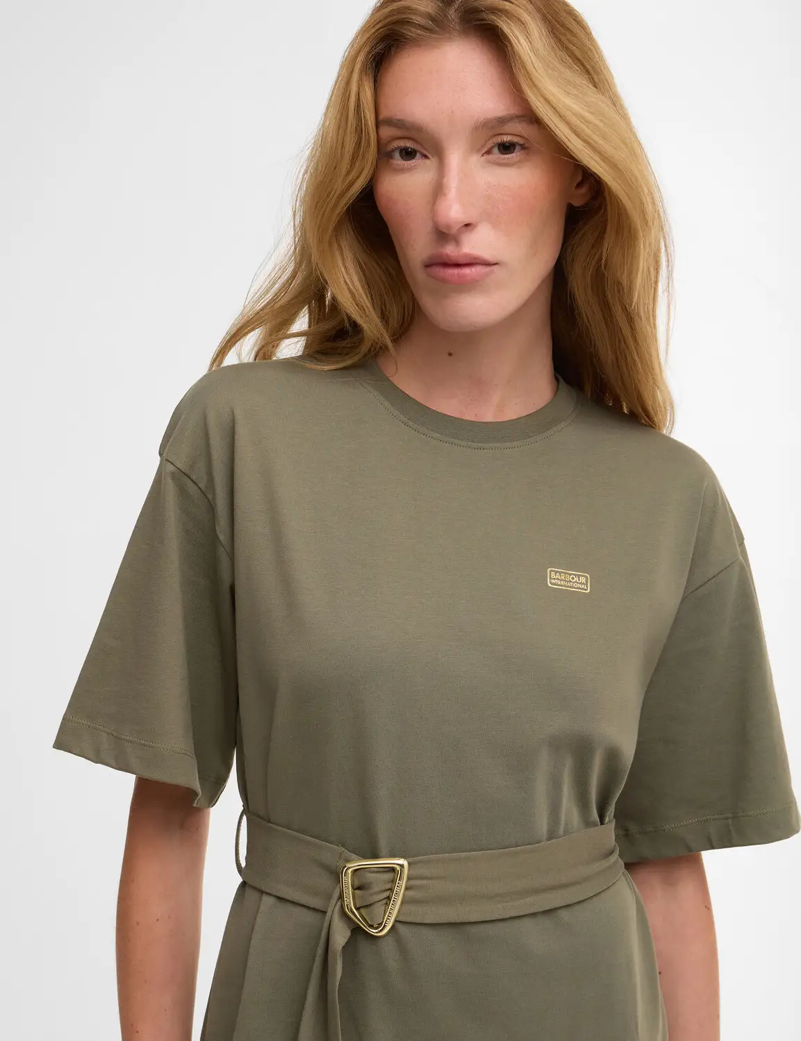 The Barbour International Uma Mini Dress, a casual cotton dress styled in a relaxed fit. This t-shirt mini dress has a classic crew neck and a self fabric belt and a Barbour Intl branded buckle for a more flattering silhouette.