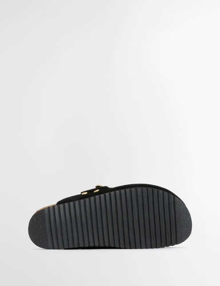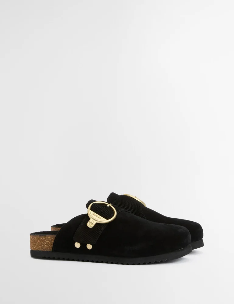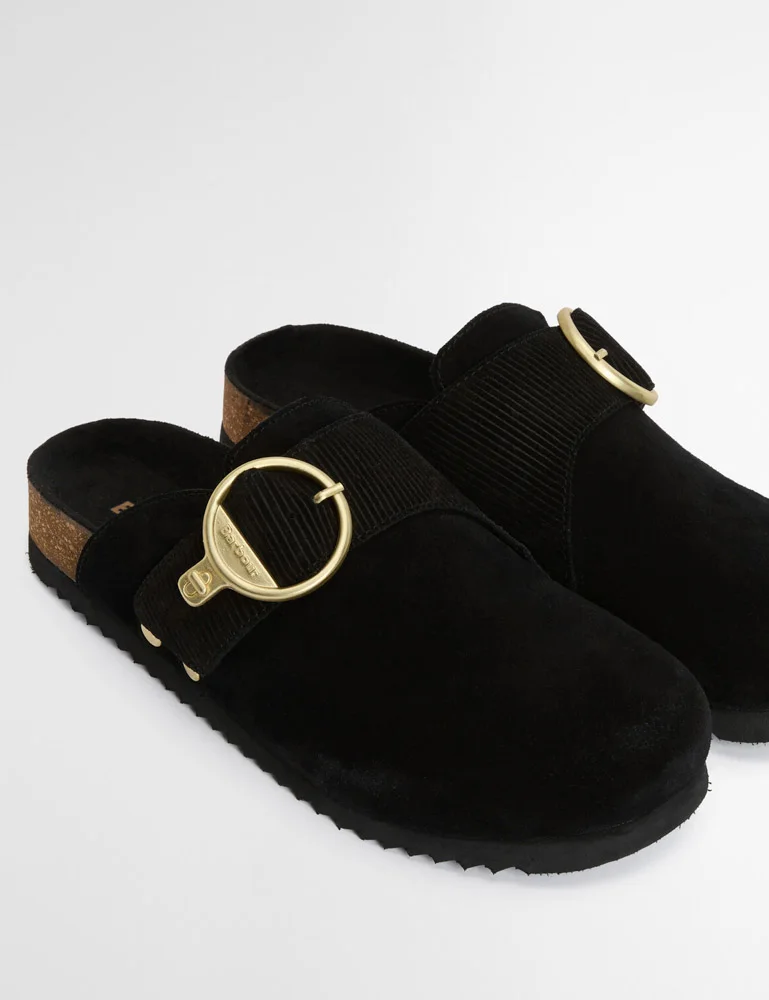 The Barbour Kyra Sandal from Barbour. A closed toe mule sandal that is crafted in a premium suede upper with a natural cork footbed. A razor edged rubber sole gives the sandal plenty of traction and the over-sized Barbour ringpull adds a modern branding touch.