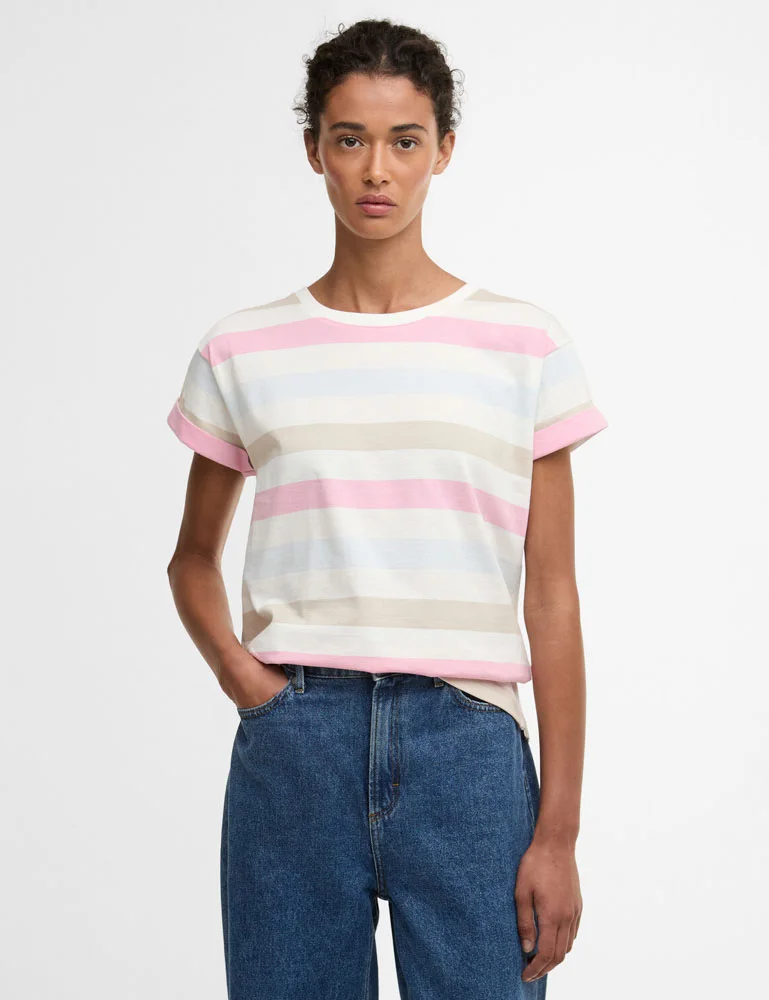The Lyndale top has a relaxed style with turn back sleeves and an all-over multi coloured stripe.