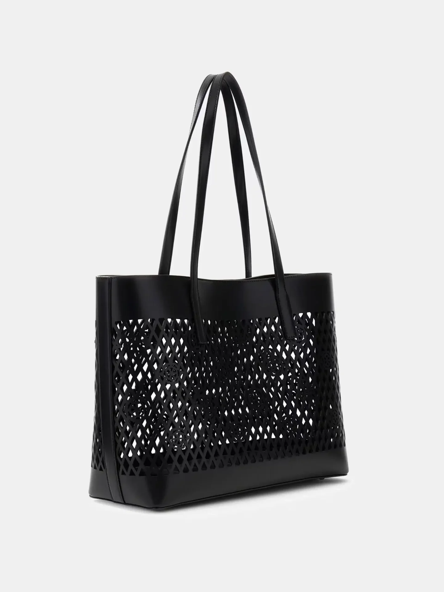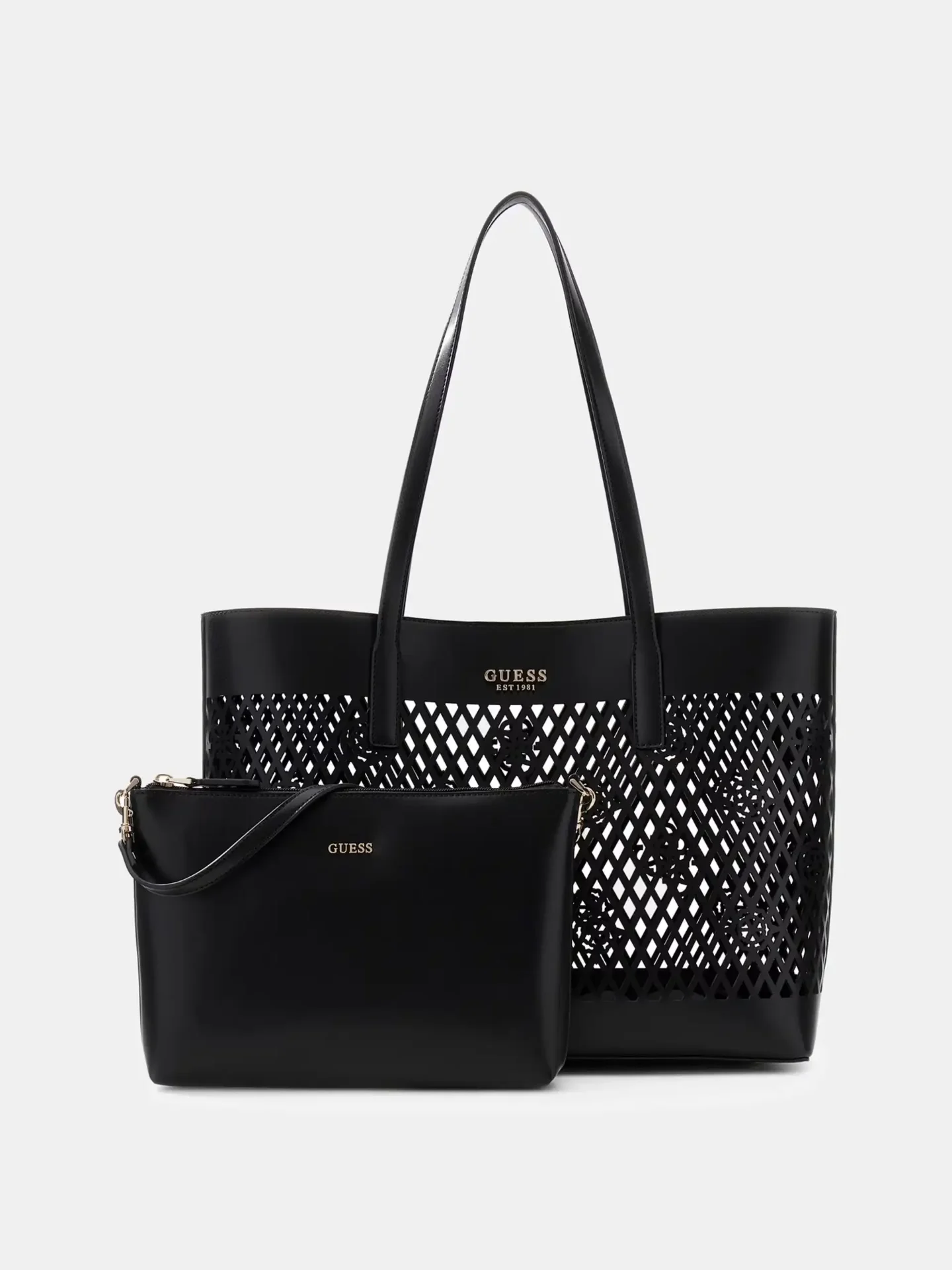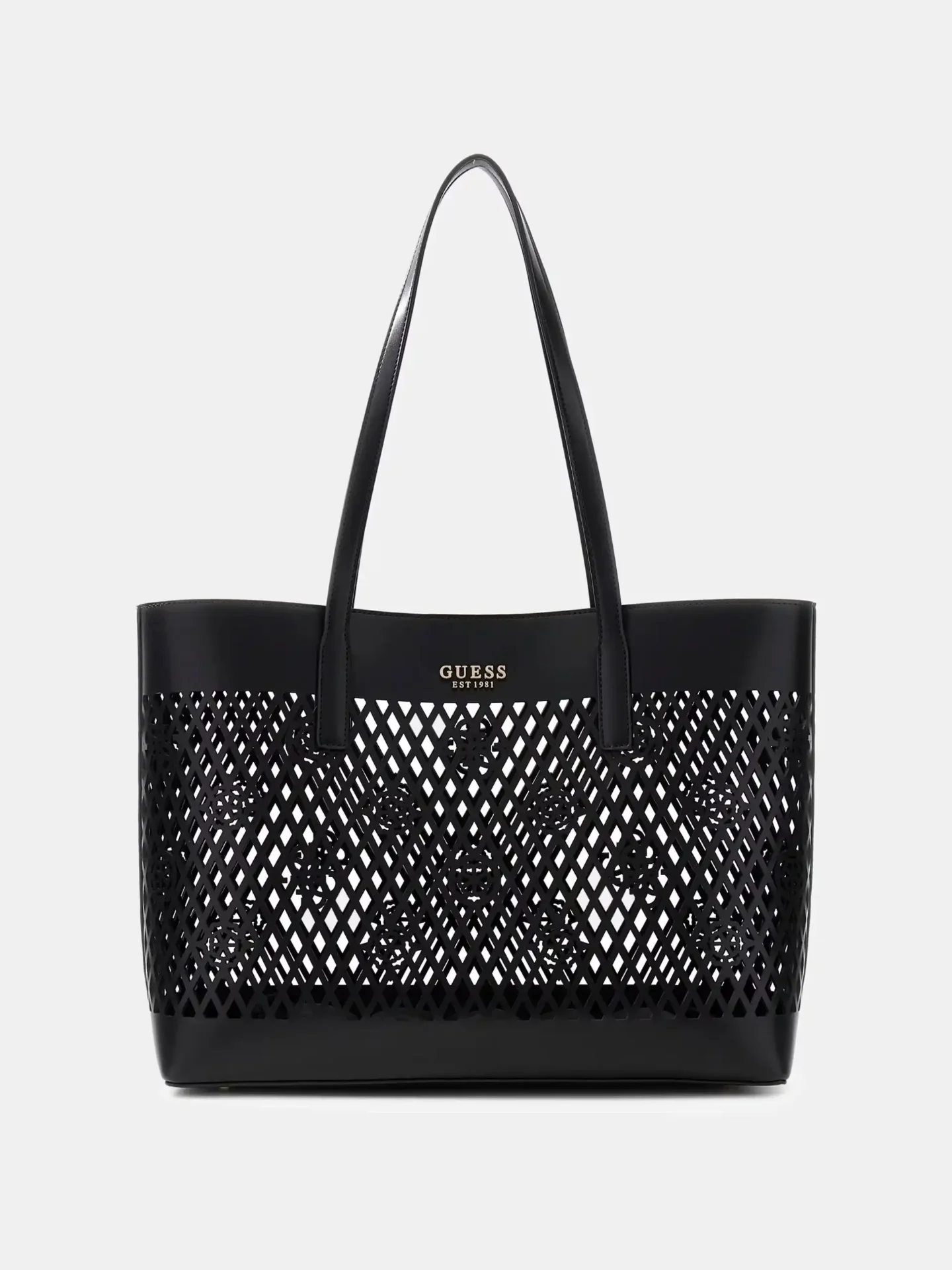 A fashionbable shopping bag from Guess. The Letty Tote is a two-in-one bag consisting of an outer shell that has a intricate lattice construction and an inner zip-top pouch to house your go to essentials.