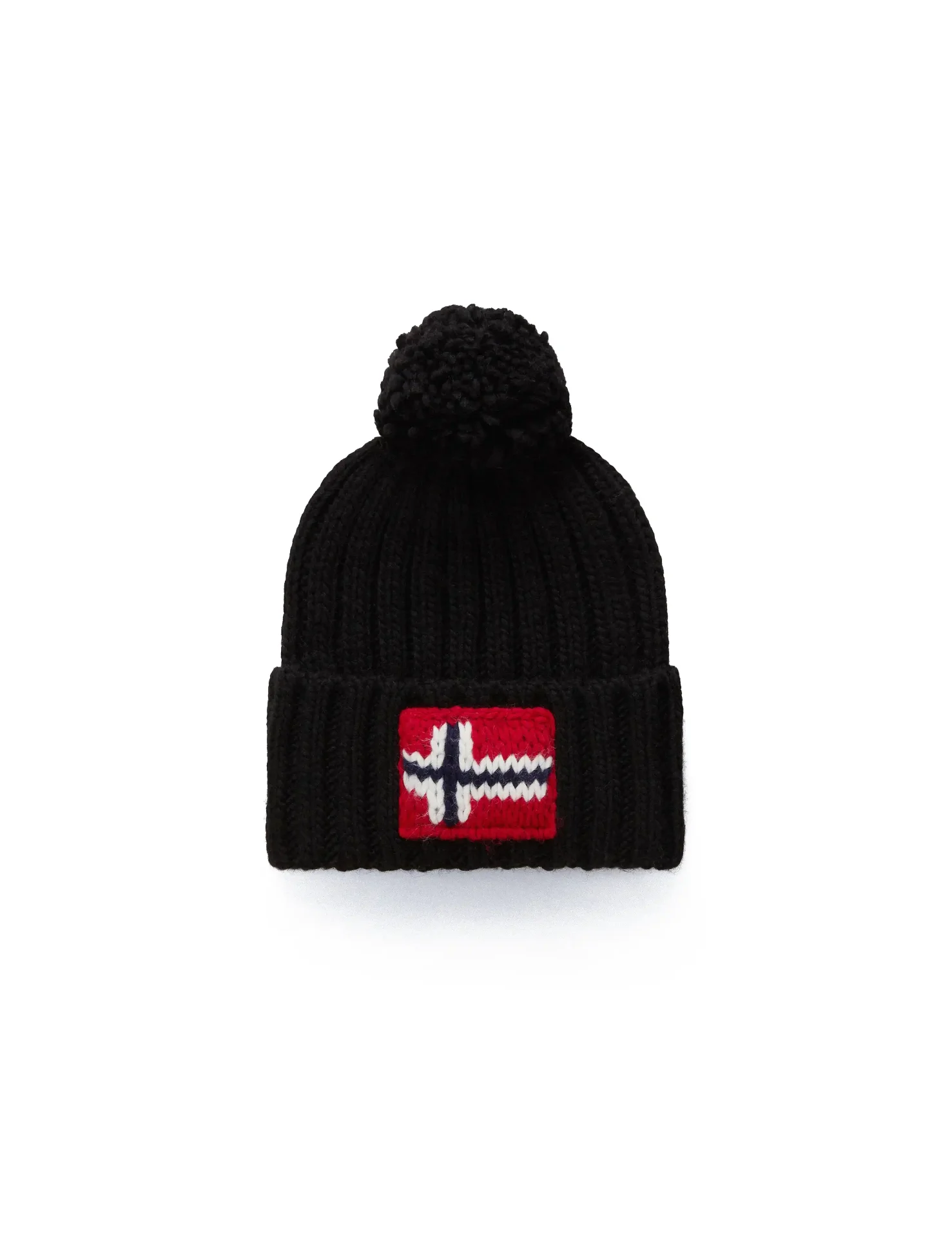 Keep toasty warm this winter with the help of the NAPAPIJRI SEMIURY knitted beanie.  A soft chunky rib knitted bobble hat with the large Norwegian flag embroidered to the front.