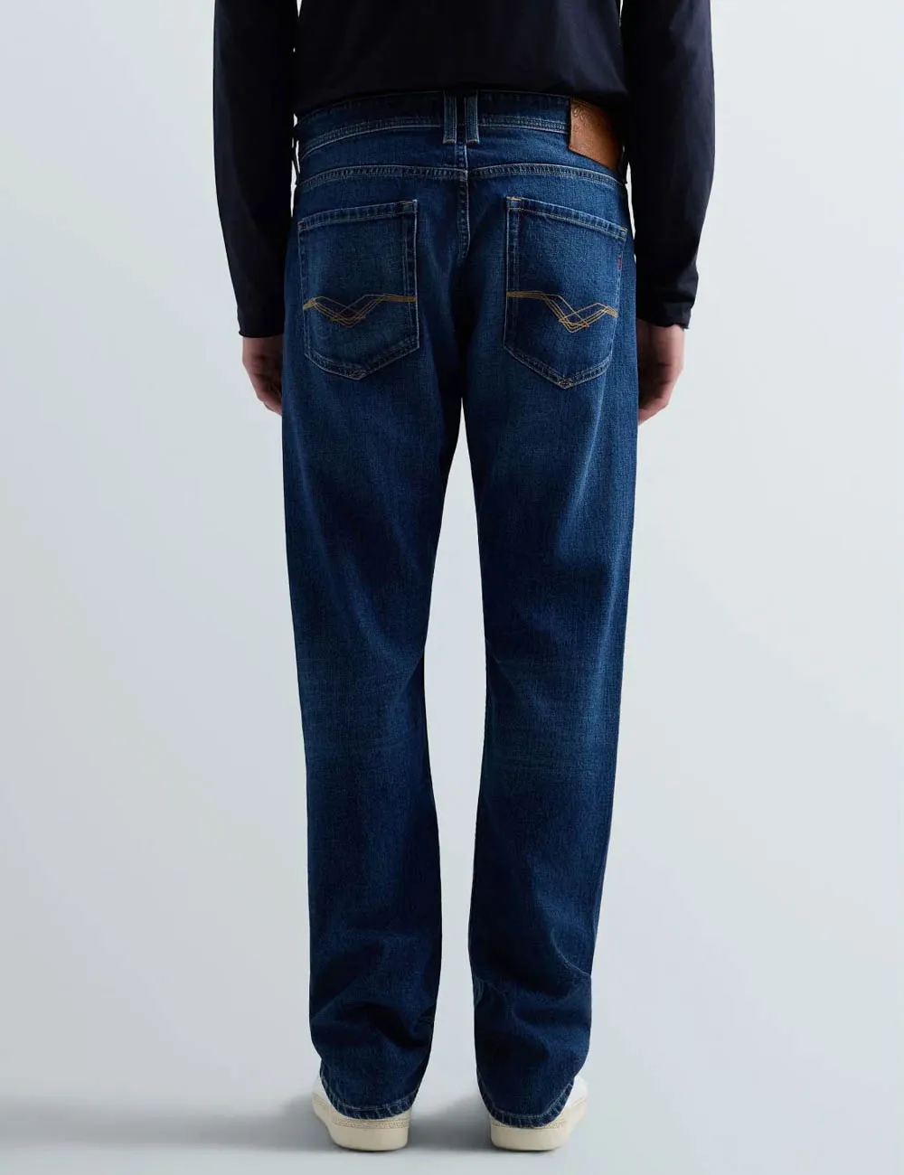The Replay Rocco Comfort-Fit Jeans deliver a relaxed take on classic denim. Crafted from 11oz blue indigo cotton comfort denim, they feature a regular rise and straight leg with a loose cut for everyday ease. A dark enzymatic stone wash with hand-finished whiskering and abrasion creates a worn-in look, while iconic gull-wing stitching and an embroidered R add signature Replay detailing.