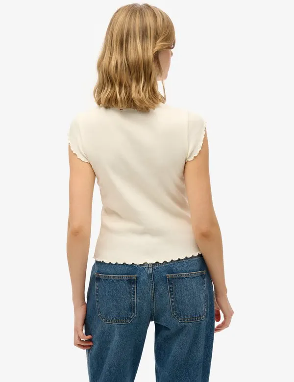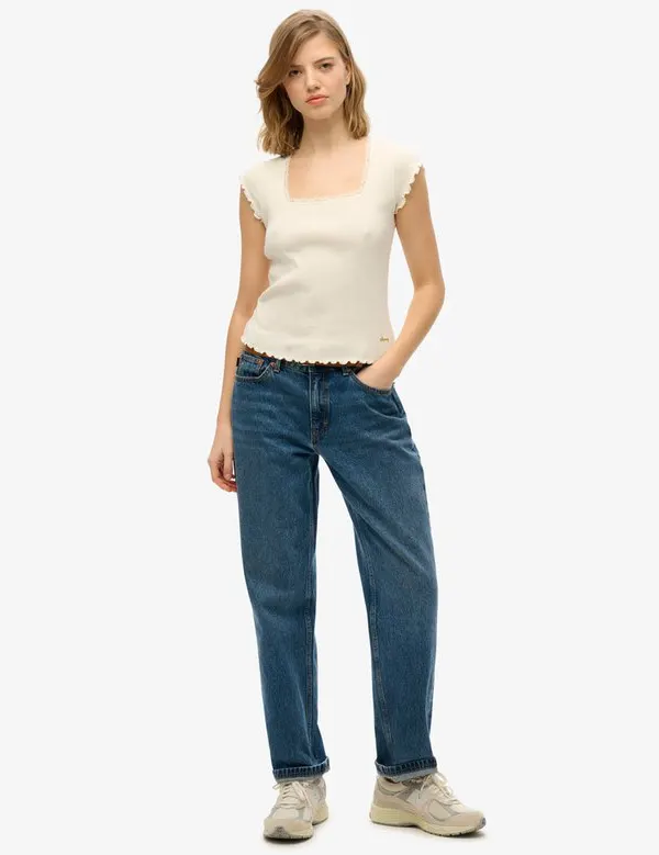 The Superdry Essential Square Neck Short Sleeve T-Shirt offers a refined, feminine take on an everyday staple. Crafted from soft ribbed fabric in a slim fit, it features a delicate lace-trim square neckline with frilled armholes and hem for a subtle, elevated finish. Completed with embroidered signature branding, it’s a versatile piece perfect for layering or styling on its own.