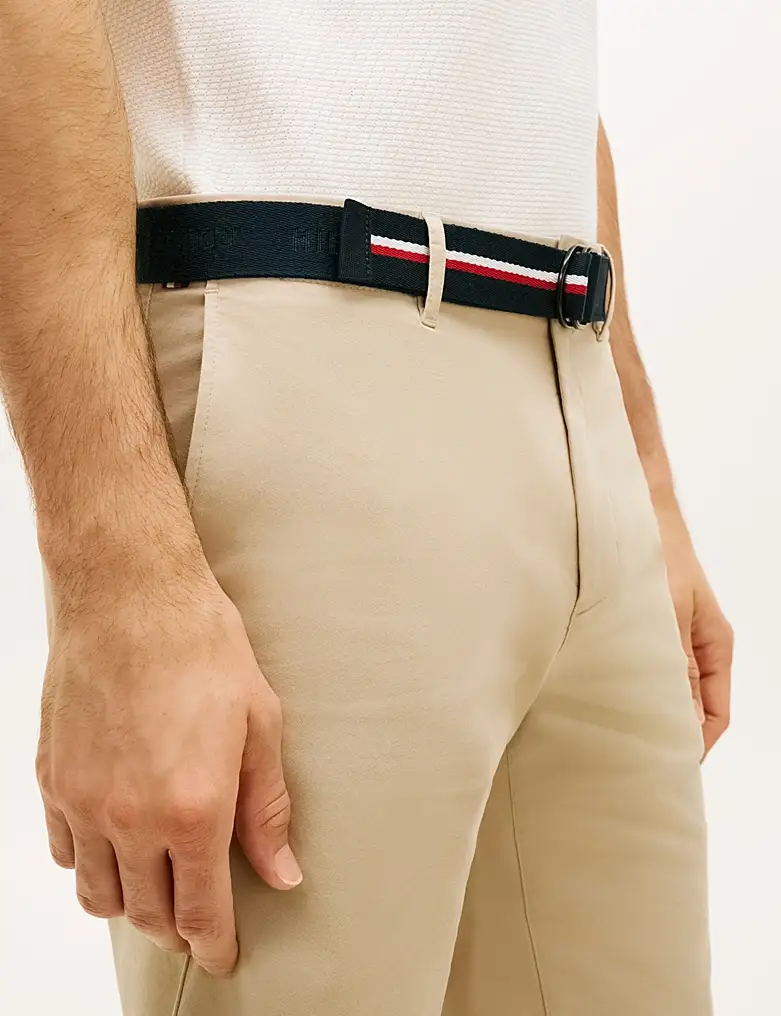 hese Tommy Hilfiger chino shorts offer a smart, effortless option for warm-weather dressing. Crafted from stretch cotton twill, they provide comfort with a clean, structured look. Designed with a straight-leg fit, they feature a zip and button fastening, angled side pockets and a removable branded belt for added style. Finished with signature tape detailing and Tommy Hilfiger branding, they deliver a polished everyday finish.