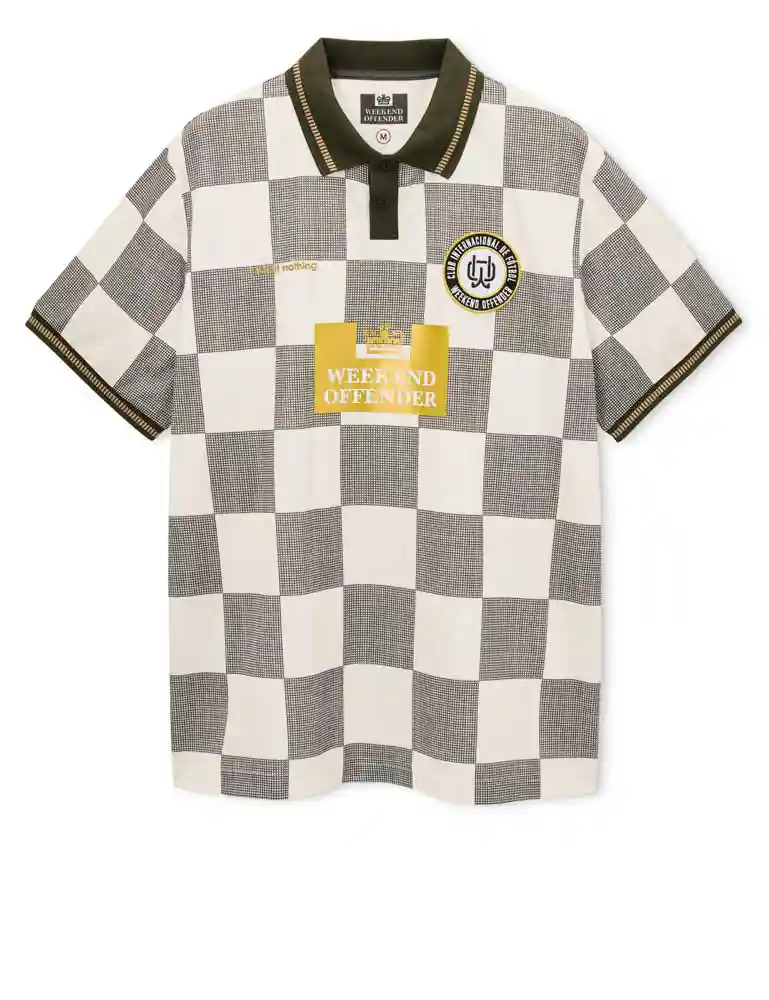 The Assi Football Shirt from Weekend Offender delivers a bold, terrace-inspired look with a premium edge. Crafted from 100% polyester in a relaxed fit, it offers lightweight comfort with a classic football silhouette. The checked design is elevated by standout metallic gold detailing, including a gold vinyl Prison patch at the chest, metallic front print, and gold-accented badge, creating a statement piece that blends sports heritage with modern street style.