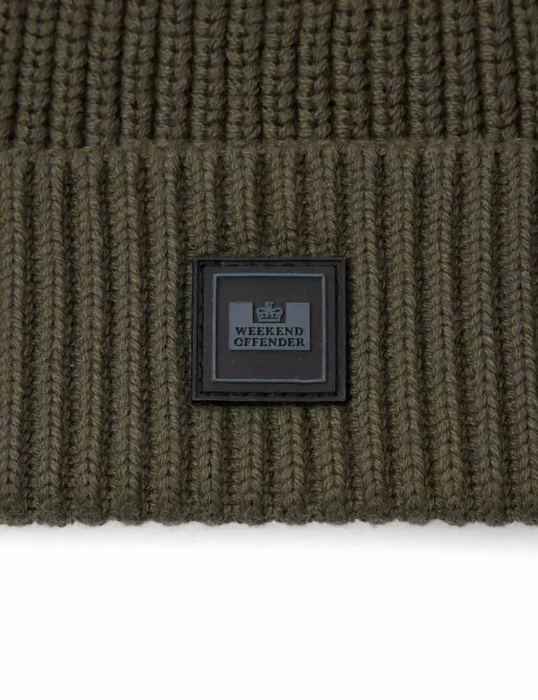 A chunky fisherman inspired rib beanie hat from Weekend Offender, complete with turn back hem and rubberised prison badge logo.