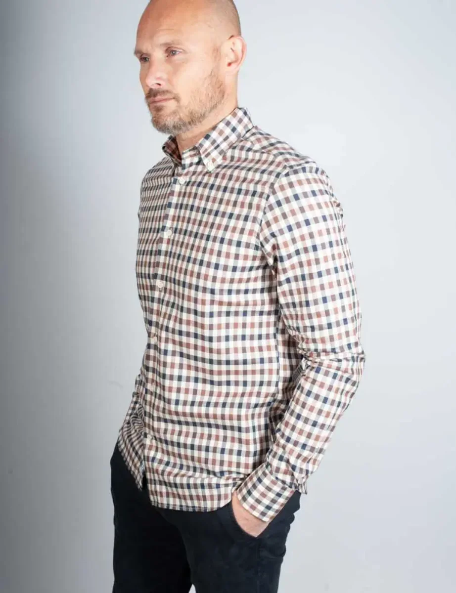 The signature long sleeve Club Check Shirt from Aquascutum Active. A timeless classic shirt crafted in rich soft cotton and styled with a button down collar and curved hem.