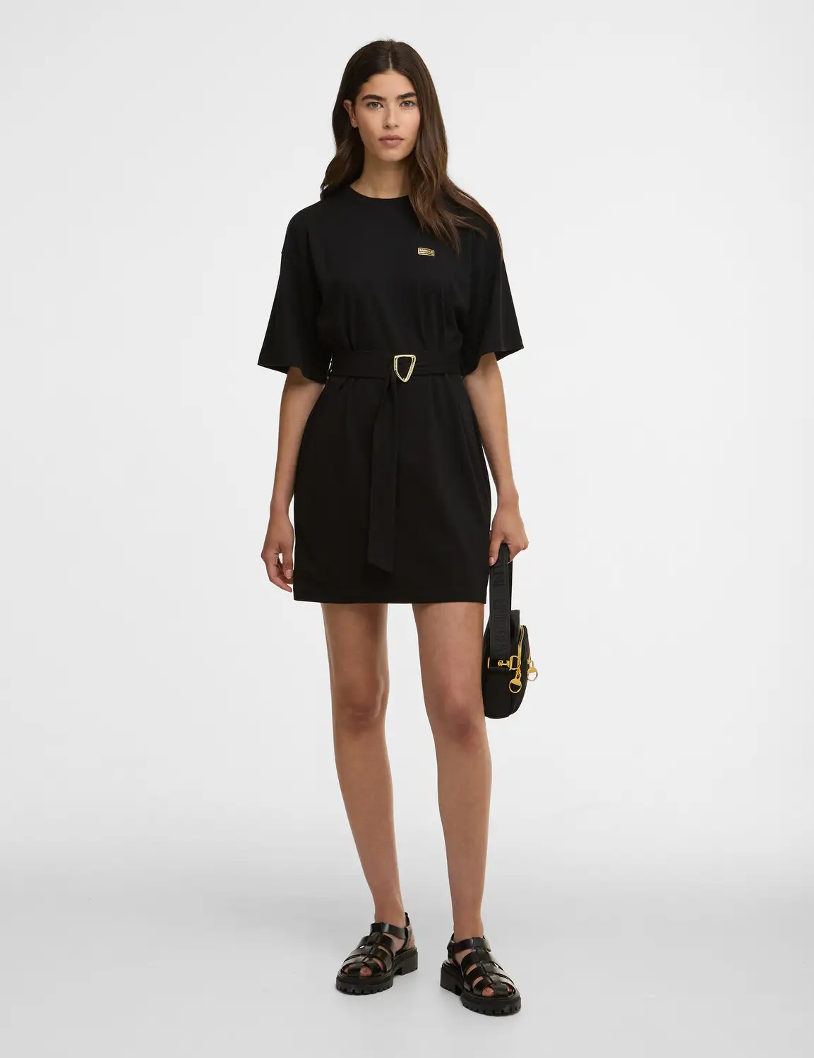 The Barbour International Uma Mini Dress, a casual cotton dress styled in a relaxed fit. This t-shirt mini dress has a classic crew neck and a self fabric belt and a Barbour Intl branded buckle for a more flattering silhouette.