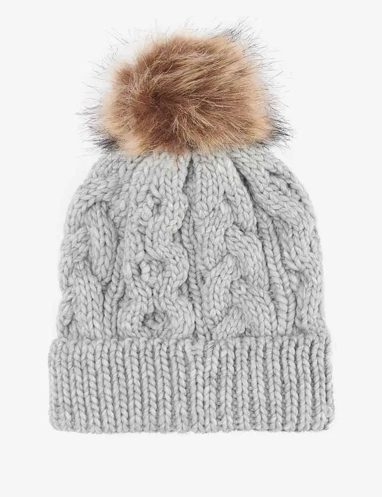 A winter essential from the Barbour womens collection.  Crafted in a chunky cable knit with a turnback hem to provide ultimate warmth. The Barbour logo patch branding and the faux fur pom-pom add the finishing touches.