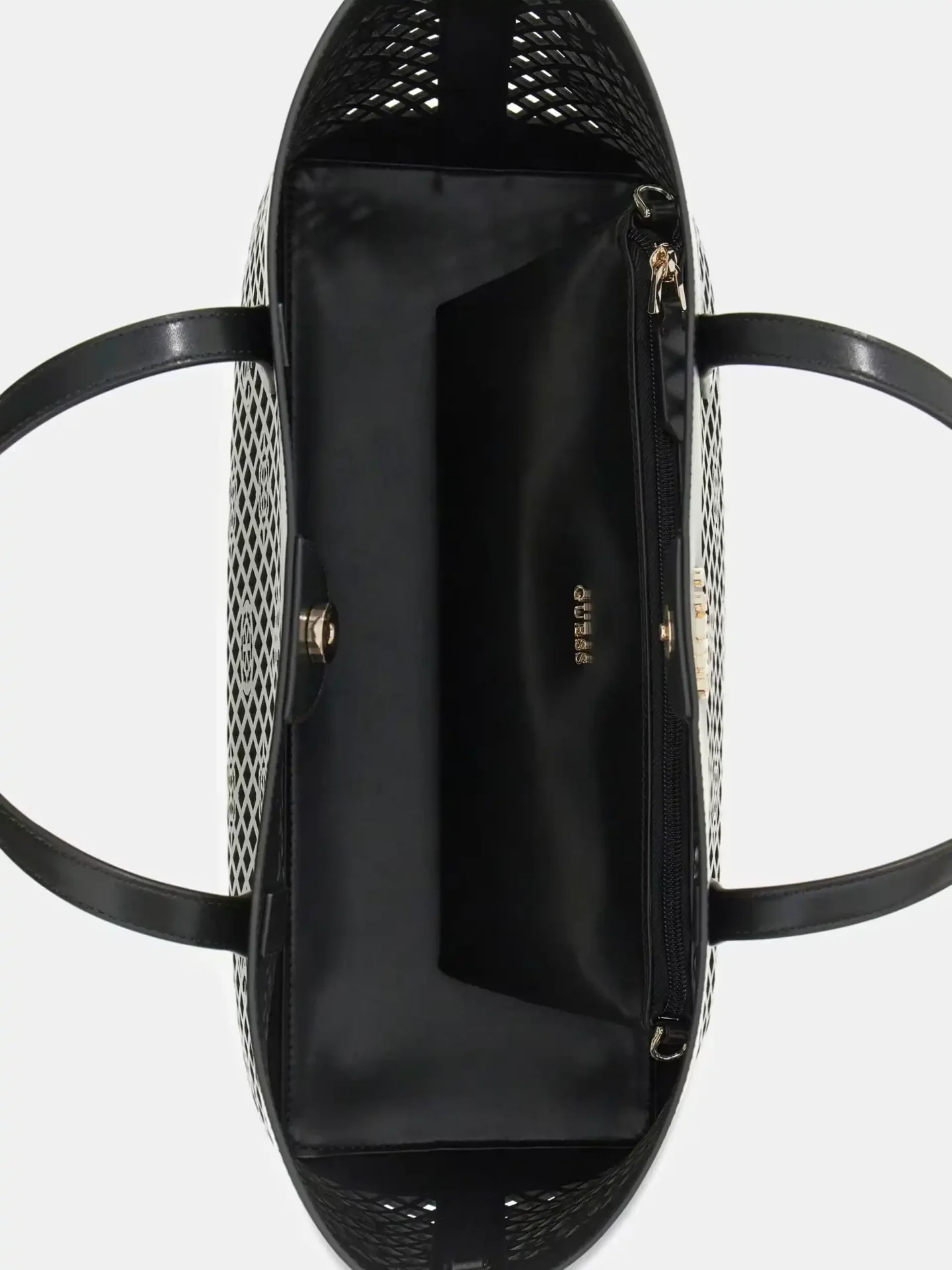 A fashionbable shopping bag from Guess. The Letty Tote is a two-in-one bag consisting of an outer shell that has a intricate lattice construction and an inner zip-top pouch to house your go to essentials.