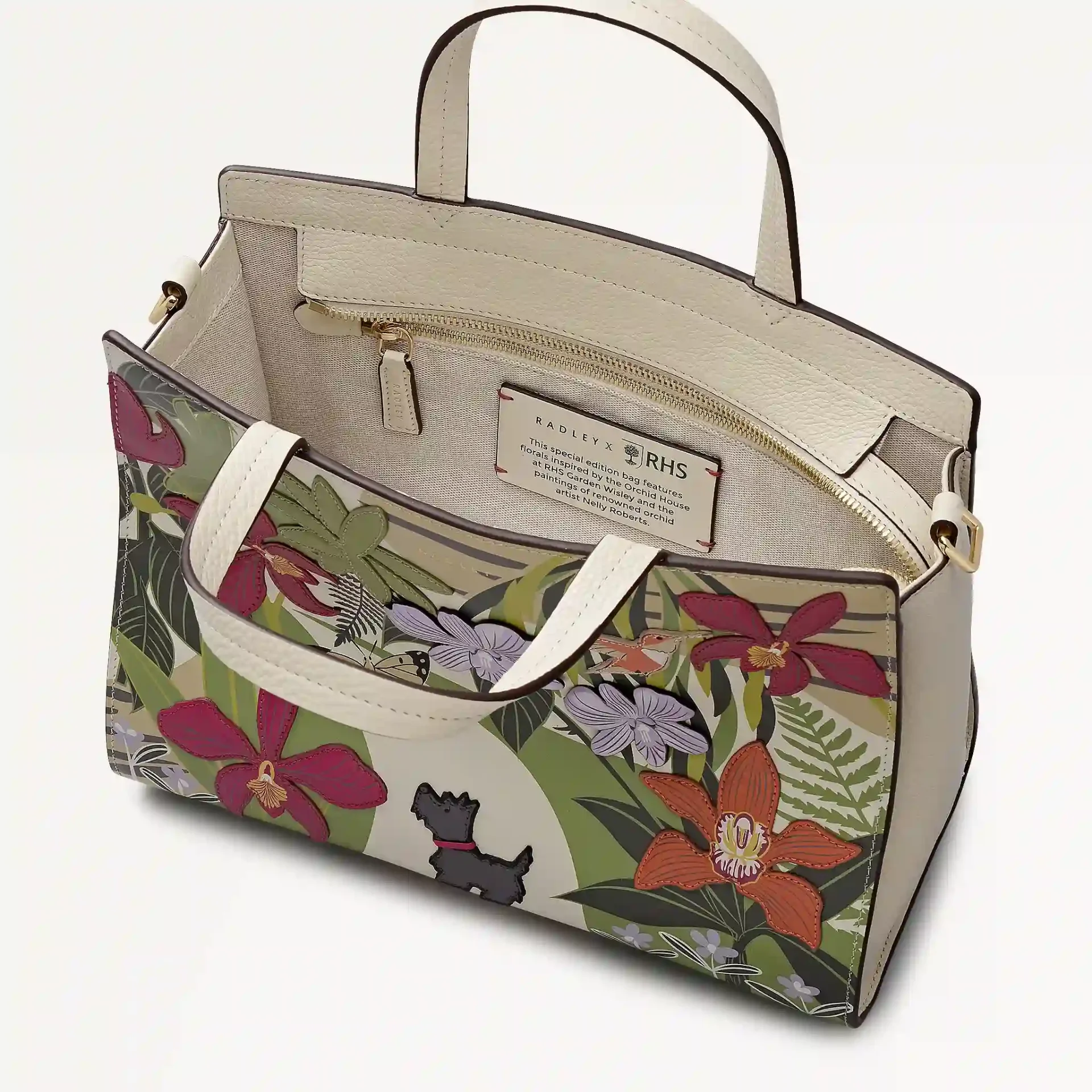 Bringing the season to life through detailed leather craftsmanship, the RHS Picture Grab Bag is a true collectible. Adorned with intricate appliqué and screen prints, it features a charming Spring scene with the iconic scottie dogs admiring an array Flowers in bloom.